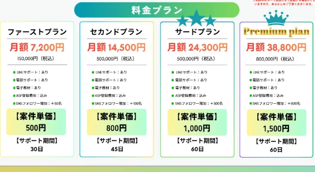 稼ぐためのサポートとして、4つのプランが用意されており、