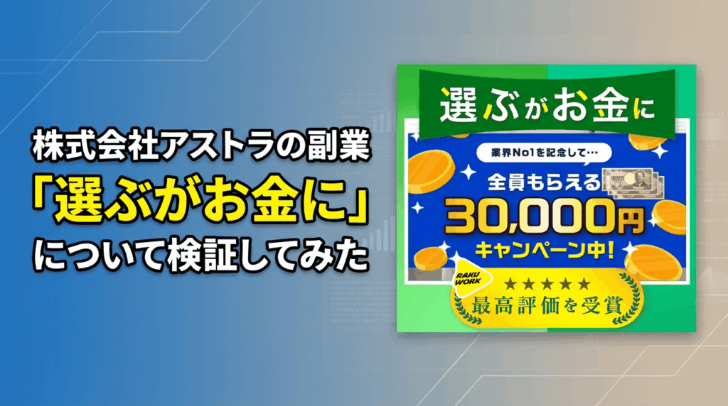 こんにちは、友作です。 今回は、 株式会社アストラが運営する副業 選ぶがお金に について検証してみました。 選ぶだけでお金がもらえる 30,000円がもらえるキャンペー... -