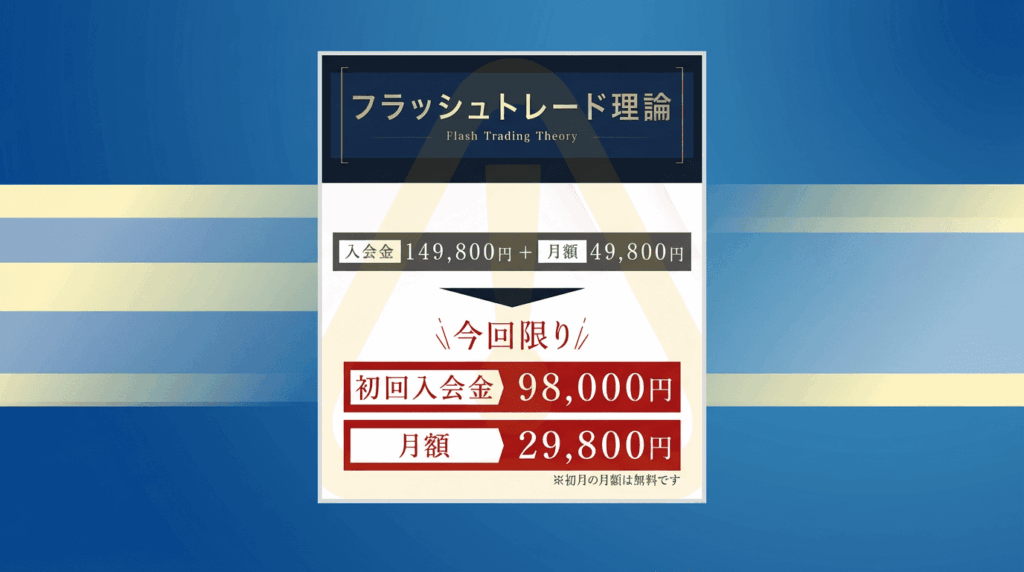 フラッシュトレード理論の参加料金は、初回入会金98,000円(税込)、2ヶ月目以降は月額29,800円(税込)です。