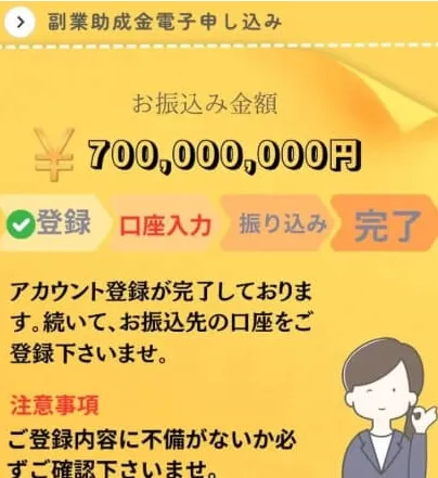 まずはじめに、「副業助成金7億円」とは、一見すると"誰でも7億円を簡単に手にできる"と宣伝しているキャンペーンのようです。