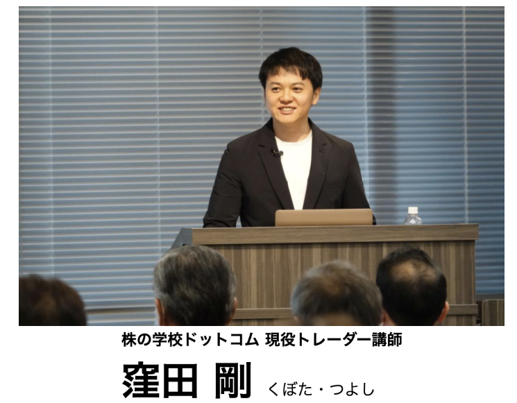 講師の窪田剛さんは1981年生まれで、2001年に30万円を元手に株式投資を始めたとされています。累計30万部の著書がありますが、具体的なトレード実績は公開されていません。