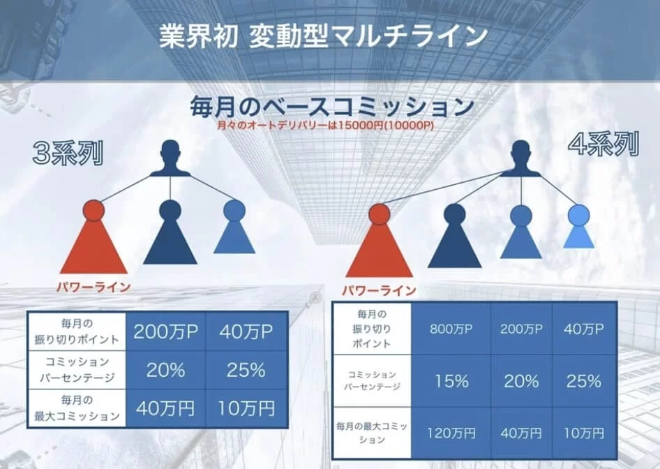 ①ベースコミッション左右2系列のうち、少ない方の売上(PT)の25%が報酬として発生両系列に売上(購入者)が必要系列数により上限あり(最大月120万円)