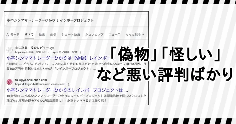 小卒シンママトレーダーひかりのレインボープロジェクトについて評判を調べると、「怪しい」「偽物」といった口コミが見つかりました。