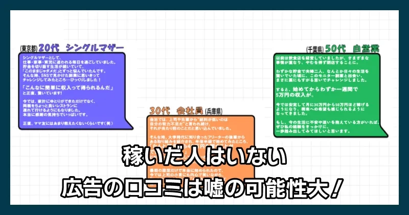 広告で謳っている「即日5万円GET」が本当なのであれば、稼いだ人の声が1つくらいあってもおかしくありません。